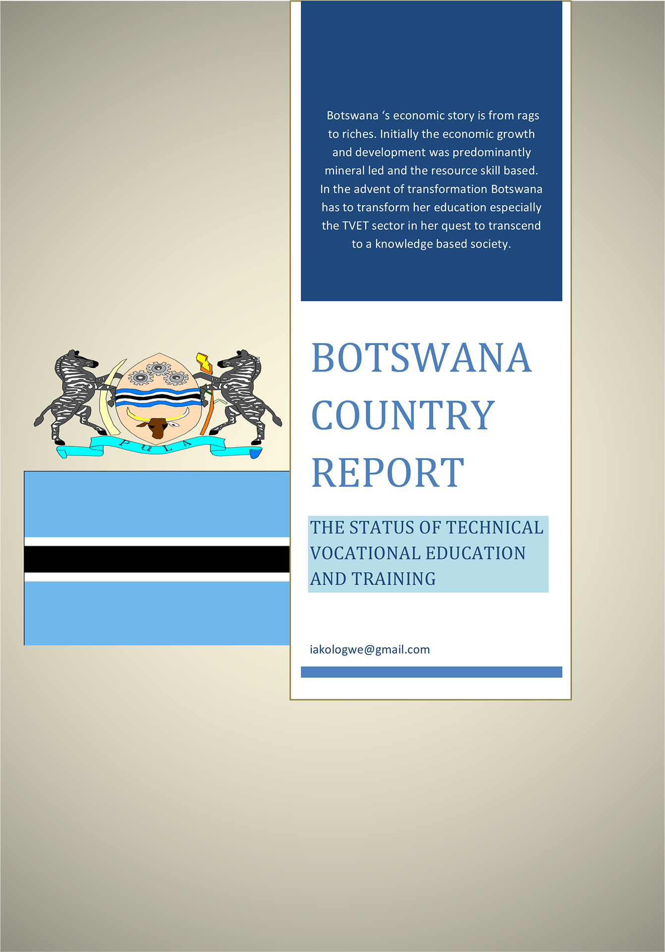 This report on Botswana outlines the nation's economic transformation from a mineral-led economy to a knowledge-based society. Despite significant economic growth, the country faces a high unemployment rate of 17.5% and a poverty rate of 30%, attributed to heavy reliance on capital-intensive mining. The report notes that the Technical and Vocational Education and Training (TVET) system in Botswana is inadequately aligned with labor market demands, contributing to high unemployment among TVET graduates. Other challenges include outdated curricula, inadequate competent trainers, low performance, poor quality facilities, and a negative perception of TVET programs.