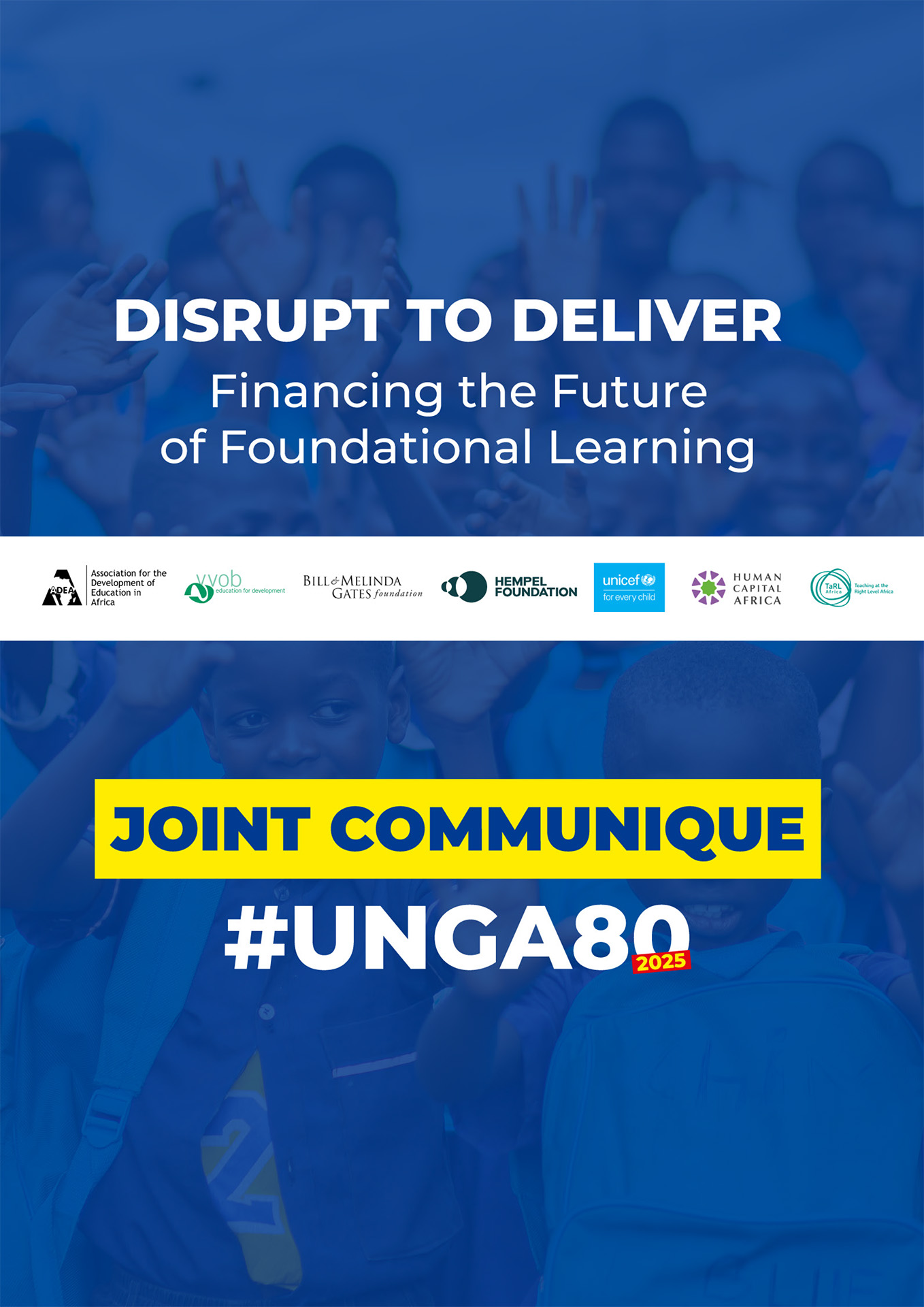 This Communique captures a landmark moment where African and global education leaders pledged an African-led shift in funding for foundational learning amid falling aid and rising debt burdens. Presented at the “Disrupt to Deliver” event on the sidelines of UNGA 80, the communiqué highlights the urgency of tackling Africa’s learning crisis—where up to 89% of children lack basic reading and numeracy skills—and the economic costs of inaction.